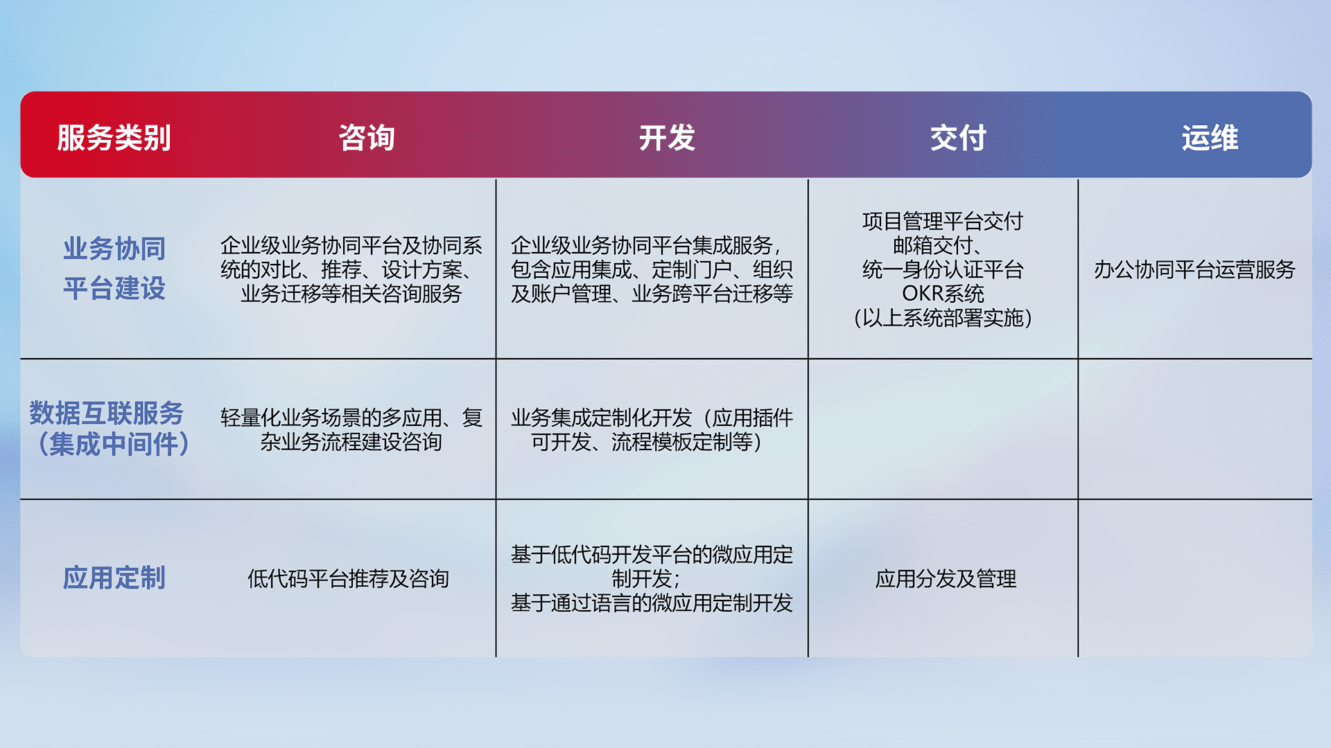 针对钉钉、、、企微、、IDaas等平台级产品提供产品的规划、、、方案、、交付、、、定制化开发等服务,,,,实现如统一协同办公、、、智能客户服务、、、混合会议管理、、、智能数据查询、、等业务场景,,,,实现数字化转型。。